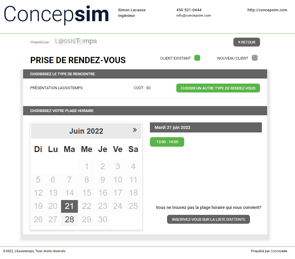 Cette nouvelle version du portail facilitera la prise de rendez-vous de vos clients grâce à son calendrier intégré et à son design plus actuel et ergonomique.