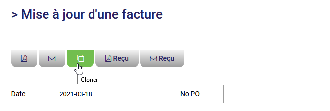 Si vous facturez régulièrement un client avec sensiblement les mêmes produits et services, vous pouvez cloner une facture existante. Pour ce faire, dans le sous-menu bleu, sélectionnez Relation d'affaires sous Fiche contact. Cliquez sur la facture à cloner puis cliquez sur cette icône pour créer votre nouvelle facture qui contiendra non seulement les coordonnées de votre client mais aussi les produits et services de la facture clonée. Vous n'aurez alors qu'à faire les ajustement requis et à compléter votre vente!