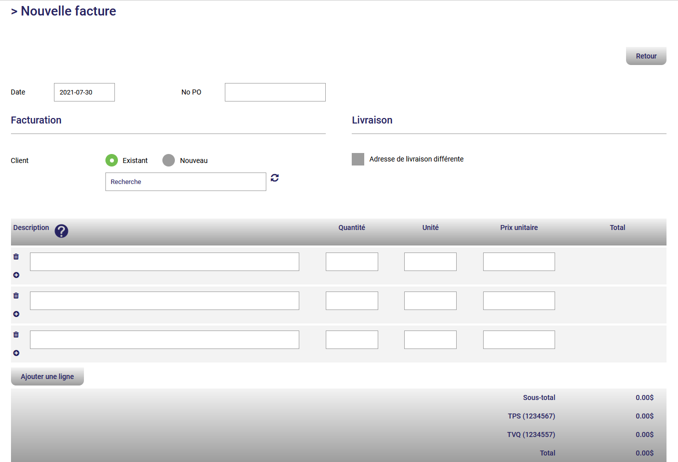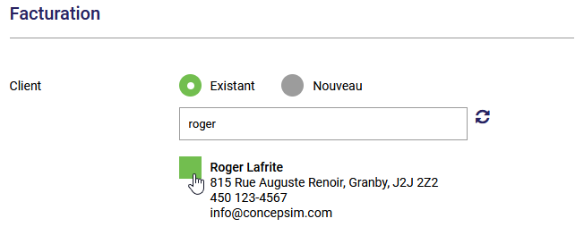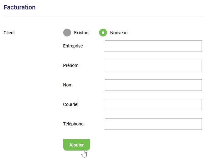 S'il s'agit d'un nouveau client, vous pouvez le créer directement dans la facture en cliquant sur la case Nouveau où vous pourrez entrer les coordonnées de votre nouveau client qui sera automatiquement ajouté à votre module de gestion des contacts.