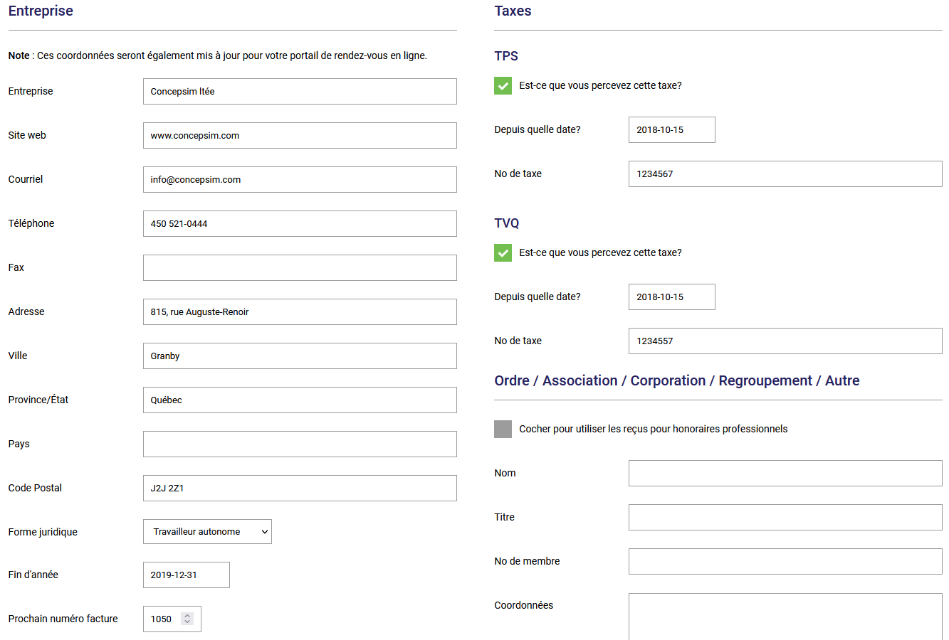 Vous pourrez entrer les coordonnées et le logo de votre entreprise qui apparaîtront en haut de vos factures. Vous pourrez également entrer un message qui apparaîtra par défaut sur vos factures ainsi que vos numéros de taxes :