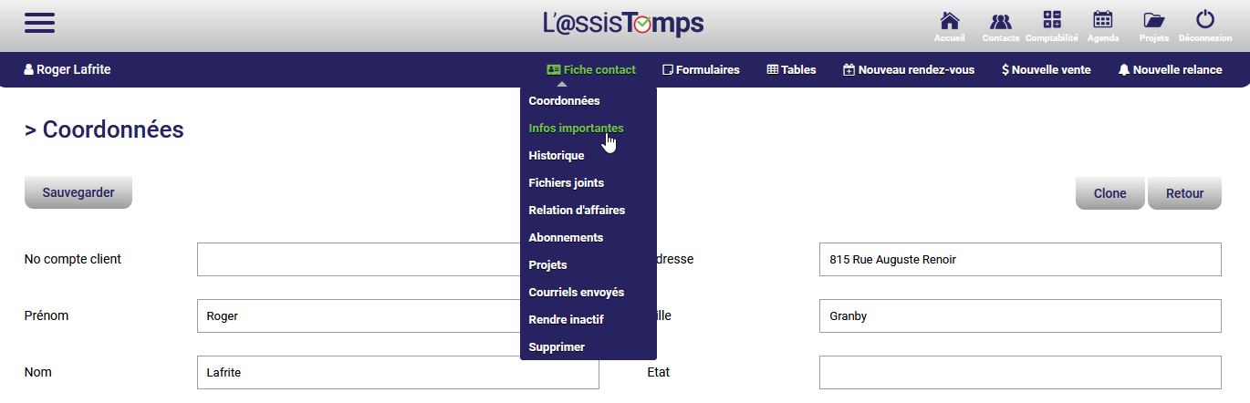 Pour créer des informations importantes, vous devez d'abord ouvrir le dossier d'un client. Par la suite, dans le sous-menu du client, sous Fiche client, sélectionnez Infos importantes :